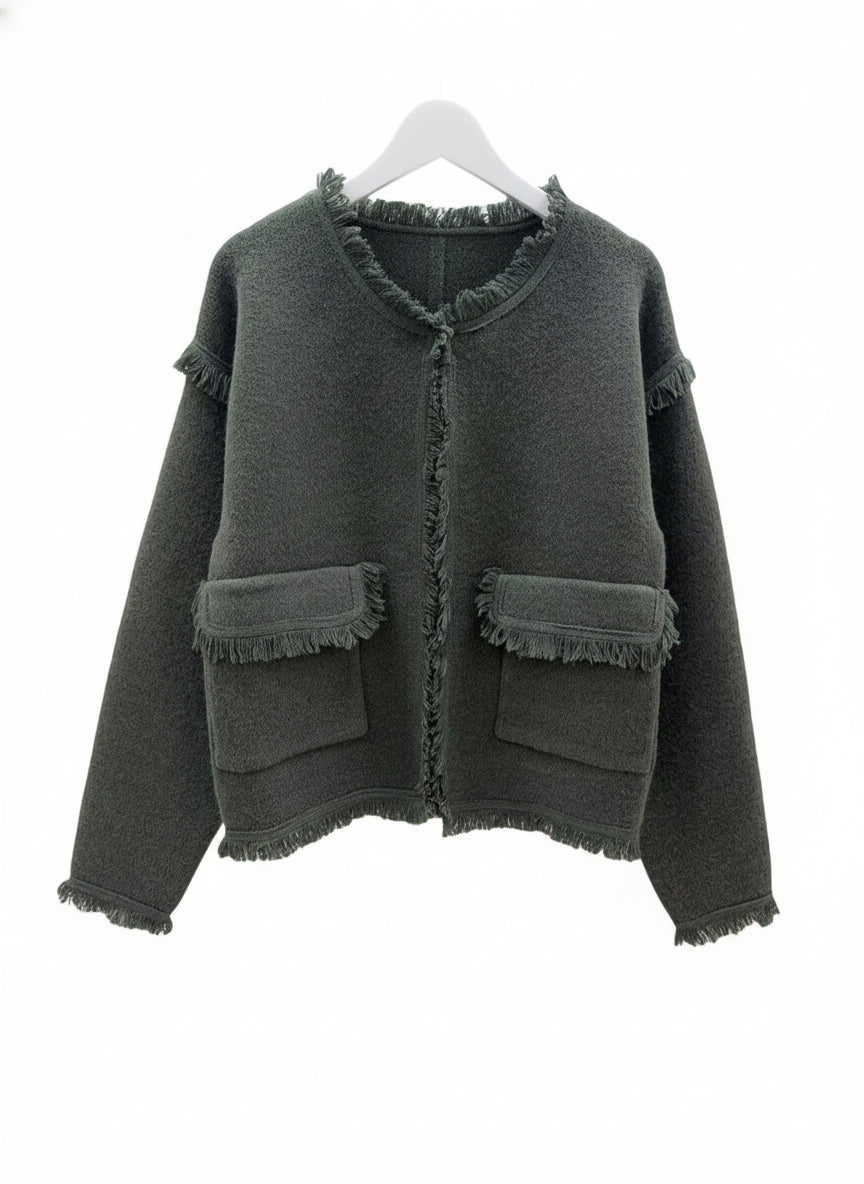 En varm jakke som oser av fransk eleganse. Strikket i en luksuriøs blanding av ull, cashmere, viskose og polyamid, og dekorert med frynser som gir et elegant utrykk og karakter til plagget.