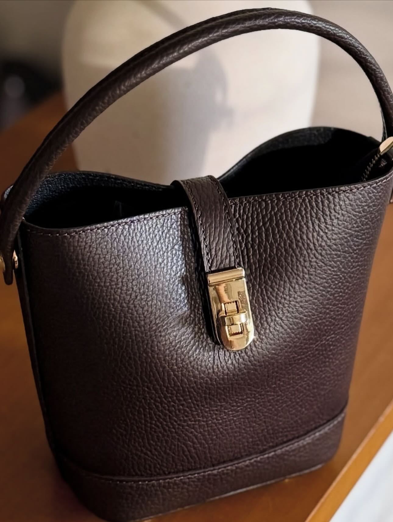 Sienna er en elegant bøtteveske laget av strukturert, formstabilt italiensk skinn. Produsert i Italia, har den et stilrent uttrykk med fine gulldetaljer og en praktisk lukking. Vesken holder formen godt og rommer det du trenger i hverdagen – perfekt til både jobb og fritid.